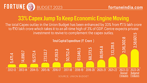 The total Capex outlay in the Union Budget 2023-24 has been enhanced by 33% from ₹7.5 lakh crore to ₹10 lakh crore, which takes it to an all-time high of 3% of GDP. The Centre expects the private investment to revive to complement the Capex outlay.
