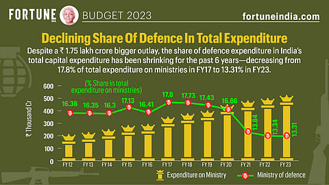 Despite a ₹1.75 lakh crore bigger outlay, the share of defence expenditure in India's total capital expenditure has been shrinking for the past 6 years -- decreasing from 17.8% of total expenditure on ministries in FY17 to 13.31% in FY23.