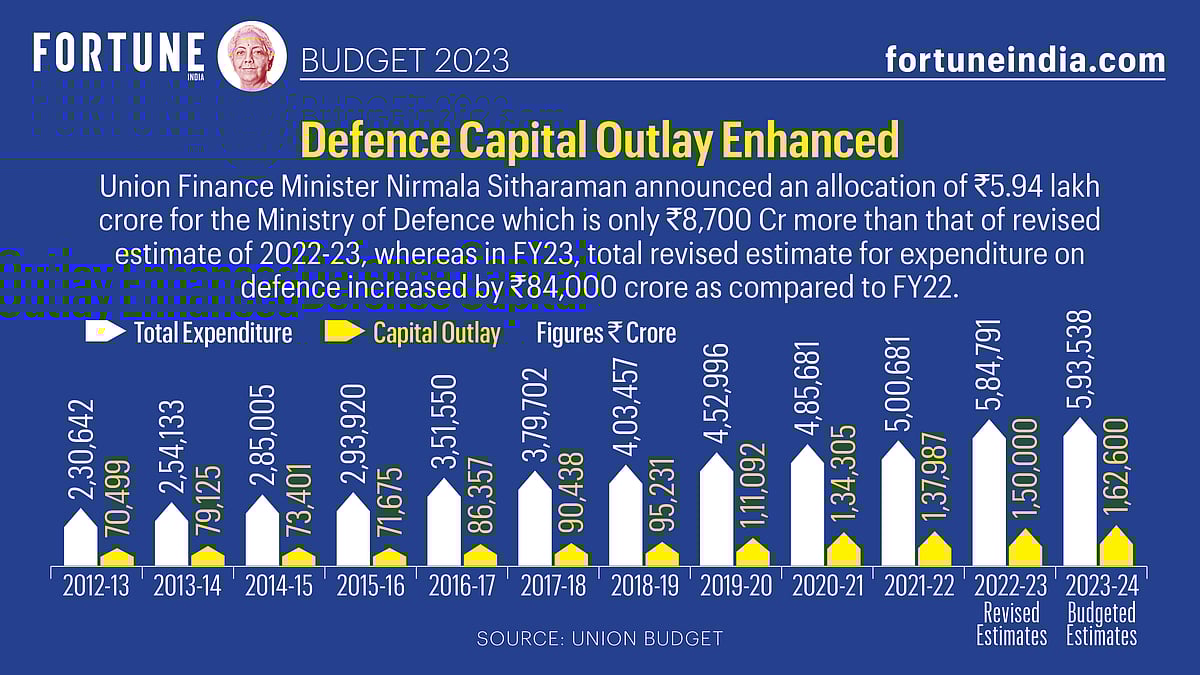 Union Finance Minister Nirmala Sitharaman announced an allocation of ₹5.94 lakh crore for the Ministry of Defence which is only ₹8,700 crore more than that of revised estimate of 2022-23, whereas in FY23, total revised estimate for expenditure on defence increased by ₹84,000 crore as compared to FY22.