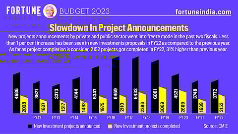 New project announcements by the private and public sectors went into freeze mode in the past two fiscals. Less than a 1% increase has been seen in new investment proposals in FY22 as compared to the previous year. As far as project completion is considered, 2,152 projects got completed in FY22, 31% higher than the previous year.