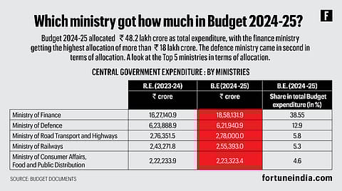 The total budget expenditure for 2024-25 is set at ₹48.2 lakh crore, with the Ministry of Finance receiving the highest allocation of over ₹18 lakh crore. The Ministry of Defence follows in second place with ₹6.21 lakh crore. Among the top five ministries, the Ministry of Road Transport and Highways, Ministry of Railways, and Ministry of Consumer Affairs and Public Distribution have been allocated ₹2.78 lakh crore, ₹2.55 lakh crore, and ₹2.23 lakh crore, respectively.