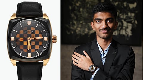 The Gukesh edition reflects Titan’s broader push towards product-led storytelling. The watch features a marquetry dial crafted from tiger eye and black agate, with design elements inspired by chess—custom indices representing different pieces, and a rotor engraved with a Grandmaster Knight motif and the inscription ‘Youngest World Chess Champion at 18’.