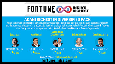Adani’s business empire is no longer confined to infra but comprises new-age sectors such as drones, telecom and data centres. What’s striking about Adani’s rise is the significant lead he has over Mukesh Ambani, who is second at $94.57 bn (₹7.54 lakh crore). The only other first-generation entrepreneur in the top five is Radhakishan Damani of Avenue Supermarts.
