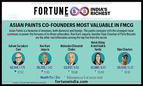 Asian Paints is a favourite of investors, both domestic and foreign. The paints company, with the strongest moat, continues to power the fortunes of its three cofounders. Ravi Kant Jaipuria of Varun Beverages and Devyani International, besides Vijay Chauhan, founder of Parle Biscuits are the other two billionaires who feature among the top five from the sector.