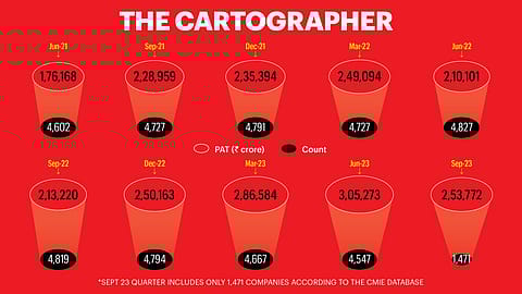 INDIA INC. SCALED NEW HIGH in profitability with a record ₹2.53 lakh crore in the September 2023 quarter. What makes this quarter stand out is that this is the aggregate profit after tax (PAT) of just 1,471 companies as per the CMIE database, and it has surpassed the ₹2.13 lakh crore net profit earned by the full set of 4,819 listed companies in the September 2022 quarter. Essentially, just a quarter of all the listed companies have generated profits higher than what all listed companies made a year ago!