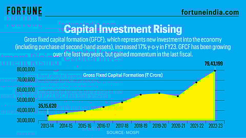 Gross fixed capital formation (GFCF), which represents new investment into the economy (including purchases of second-hand assets), increased 17% y-o-y in FY23. GFCF has been growing over the last two years, but momentum in investments gained in the last fiscal.
