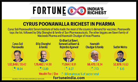 Cyrus Soli Poonawalla’s Serum Institute of India made the most of the country’s demand for vaccines. Though unlisted, Poonawalla tops the list, followed by Dilip Shanghvi & family of Sun Pharmaceuticals. The other two biggies are Bawri family of Macleods Pharmaceuticals and Hasmukh Chudgar of Intas Pharma.
