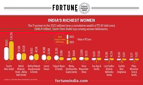 The 11 women in the 2023 edition have a cumulative wealth of ₹3.81 lakh crore ($46.41 billion). Savitri Devi Jindal tops among women billionaires.