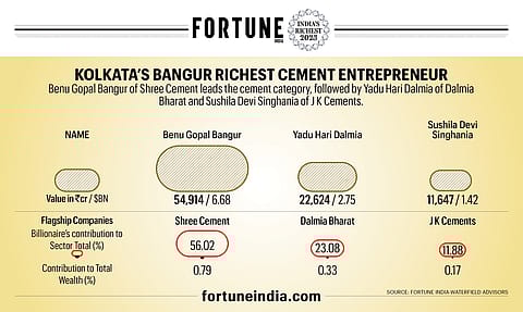 Benu Gopal Bangur of Shree Cement leads the cement category, followed by Yadu Hari Dalmia of Dalmia Bharat and Sushila Devi Singhania of J K Cements.