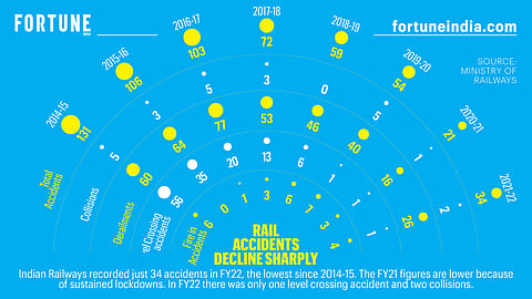 Indian railways recorded just 34 accidents in FY22, the lowest since 2014-15. The FY21 figures are lower because of sustained lockdowns. In FY22, there was only one level crossing accident and two collisions.