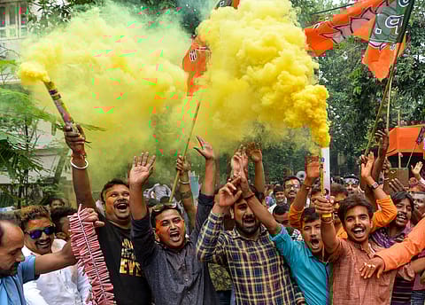 Supporters of Bharatiya Janata Party (BJP) hold colour smoke crackers as they celebrate on the vote results day for India's general election in Siliguri on May 23, 2019.