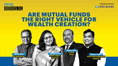 Explore the potential of mutual funds in building long-term wealth with insights from industry leaders—Nilesh Shah (Kotak Mutual Fund), Radhika Gupta (Edelweiss Mutual Fund), Jignesh Desai (NJ Group), and Navneet Munot (HDFC Asset Management Company Ltd.)—at the Fortune India Boardroom. Presented in partnership with IndiQube.