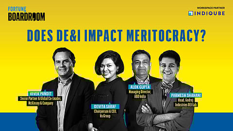 Is diversity, equity, and inclusion reshaping the concept of meritocracy? At the Fortune India Boardroom, industry leaders Vivek Pandit (McKinsey & Company), Zainab Patel (The Trans Café & Salon), Devita Saraf (Vu Group), Alok Gupta (ABD India), and Parmesh Shahani (Godrej Industries DEI Lab) engage in a compelling discussion on the evolving definitions of leadership and opportunity in corporate India. Presented in partnership with IndiQube.