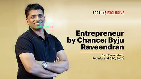 Capturing his story from being a small-town boy to a billionaire, Byju Raveendran, founder and CEO, of edtech firm Byju’s told Fortune India that he ended by becoming an engineer because he was “good at math” and that it was the “default option” for a south Indian child. “An engineer by chance, a teacher by choice for sure, which made me an entrepreneur by chance,” Raveendran says, in an exclusive interview.