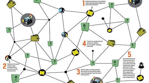 For a better grasp of things, imagine a group of accountants working in a public square. Each has their own workstation and a copy of the ledger of transactions. Anyone in the square can have a look at these records. Whenever people in the public square transact with each other—say one sells the other a Rs 10 ice cream—they tell the nearest accountant. Hundreds of such transactions occur simultaneously; the accountant gets records of these bundled together, like a ‘block’ of transactions (which makes a blockchain unit). To secure a block, the accountant runs its data through a set of mathematical formulae that throw up a random string of numbers and letters, called a ‘hash’. The accountant records this string with the block, like a seal approving all the transactions recorded in it. The first accountant to crack and verify a block alerts all the others right away. If all the other accountants also record that Rs 10 sale at the same time, the group considers the sale valid and recorded. Meanwhile, onlookers can check the record in any ledger nearest to them.