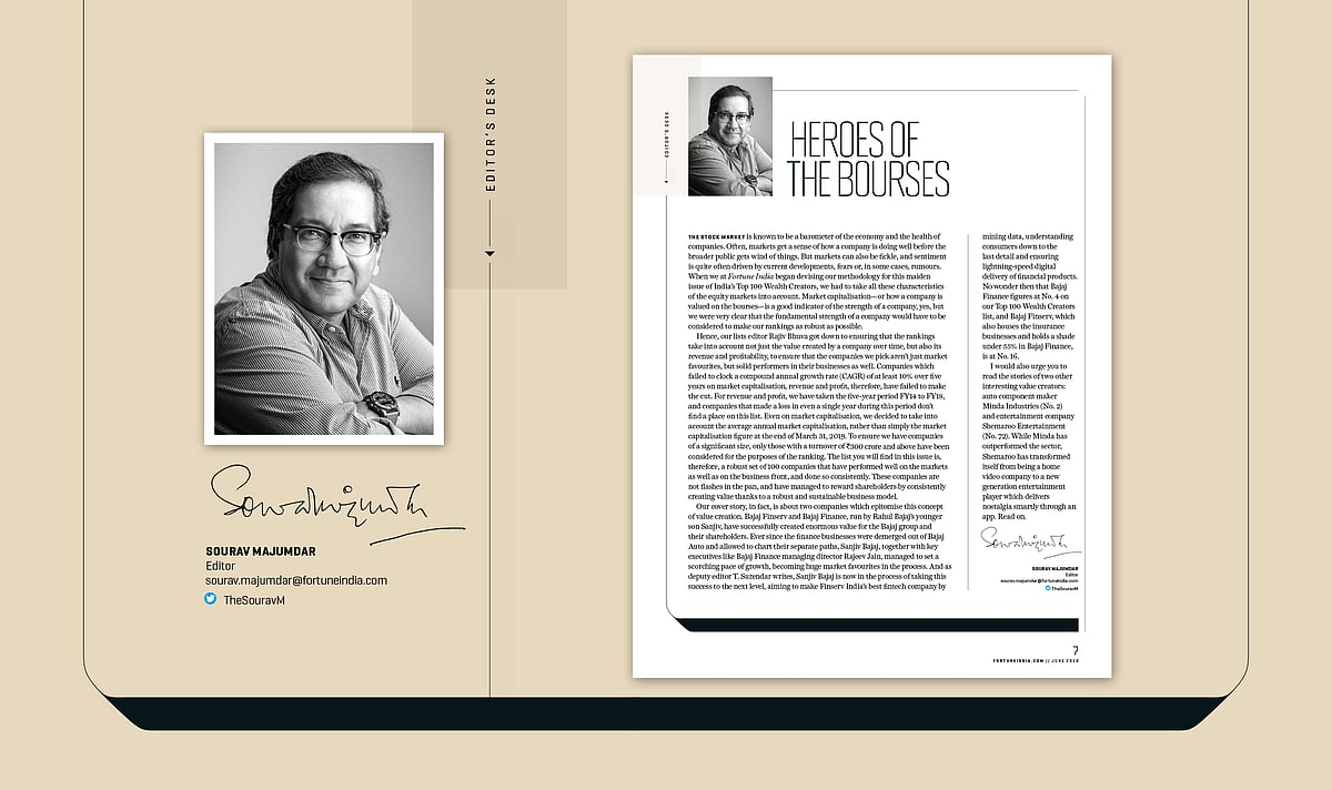 The stock market is known to be a barometer of the economy and the health of companies. Often, markets get a sense of how a company is doing well before the broader public gets wind of things. But markets can also be fickle, and sentiment is quite often driven by current developments, fears or, in some cases, rumours. When we at Fortune India began devising our methodology for this maiden issue of India’s Top 100 Wealth Creators, we had to take all these characteristics of the equity markets into account. Market capitalisation—or how a company is valued on the bourses—is a good indicator of the strength of a company, yes, but we were very clear that the fundamental strength of a company would have to be considered to make our rankings as robust as possible.