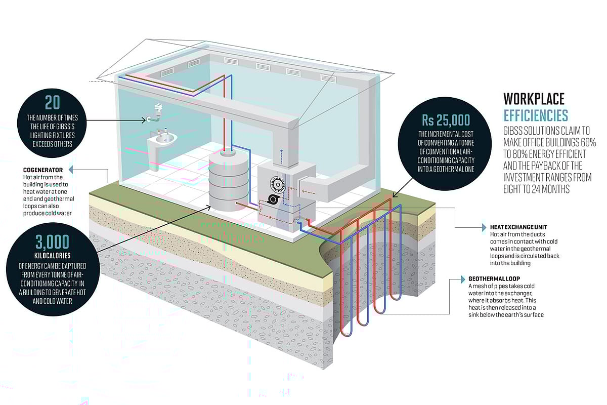 In most cases, GIBSS’s solutions (it’s the only outfit in India offering these kind of solutions) add to the savings from reduced energy consumption through LED and five star-rated appliances that buildings usually use. “In a building, 80% of the energy consumed is due to air-conditioning, lighting, and hot water. We work to reduce the consumption of each by 60% to 80%,” says Shenoy. Kaprekar adds that making changes in equipment design (using principles of geothermal energy) and the way they are installed make the difference.