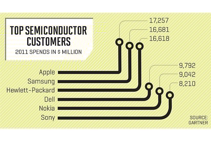 The global fascination with (and demand for) iPhones and iPads has touched the semiconductor industry. Last year, Apple became the largest consumer of semiconductor components such as chips. According to IT research and advisory firm Gartner, Apple spent $17.26 billion (Rs 86,438 crore) in 2011— almost 35% more than in 2010 —to buy components. That’s 5.7% of the $302.1 billion semiconductor market. “The swelling shares of smartphone companies such as Apple, Samsung, and HTC, increased semiconductor demand. Tablets were also a growth driver for the market throughout 2011,” says Masatsune Yamaji, principal research analyst, Gartner.