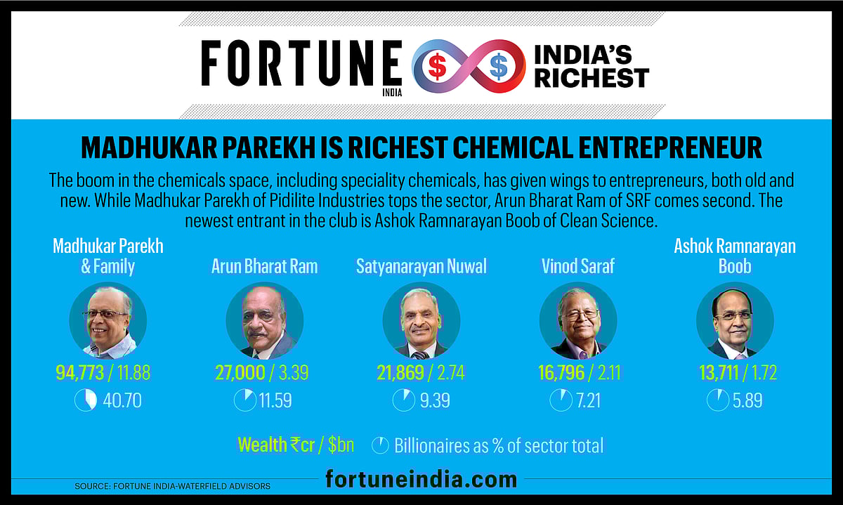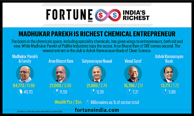 The boom in the chemicals space, including speciality chemicals, has given wings to entrepreneurs, both old and new. While Madhukar Parekh of Pidilite Industries tops the sectoral chart at ₹94,773 crore, Arun Bharat Ram of SRF comes second at ₹27,000 crore. The newest entrant in the club is Ashok Ramnarayan Boob of Clean Science.