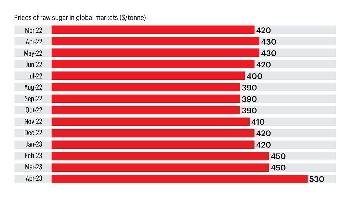 GLOBAL RAW SUGAR futures recently hit an 11-year high even as domestic prices have been trending higher on lower output concerns over fears of a prolonged El Nino effect. The All India Sugar Trade Association has trimmed production estimates by 3% for the crop year spanning October 2022 to September 2023. While 65% of sugar produced is consumed for industrial uses, rising sugar prices could result in higher inflation given food products' weightage of 24.38% in the WPI. If sugar prices stay elevated, FMCG players' margins could also come under pressure over the next couple of quarters.