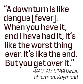 In the middle of the global downturn in 2009, Raymond reported its biggest ever loss of Rs 229 crore. “A downturn is like dengue [fever]. When you have it, and I have had it, it’s like the worst thing ever. It’s like the end,” he says. “But you get over it.” Raymond spent 2010-11 implementing a turnaround strategy, including trouble shooting. In 2011-12, it refocussed on long-term thrust areas.