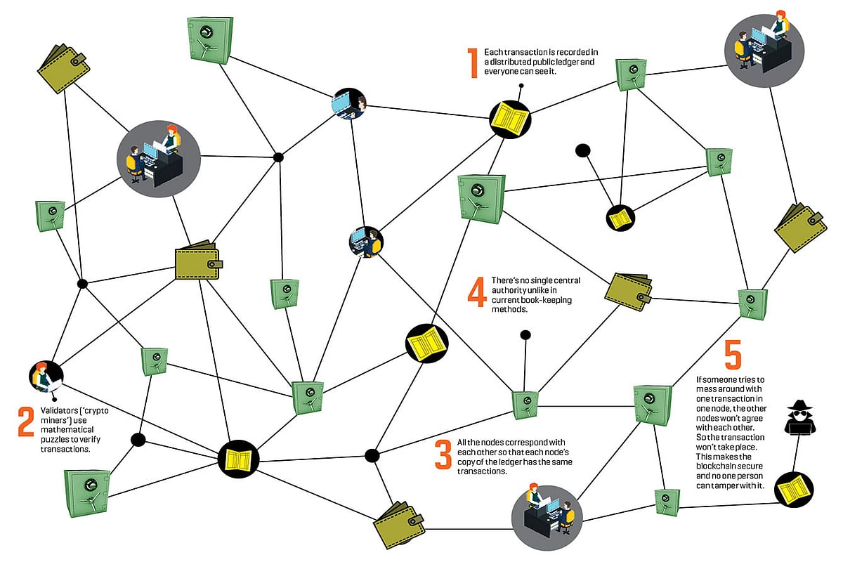 For a better grasp of things, imagine a group of accountants working in a public square. Each has their own workstation and a copy of the ledger of transactions. Anyone in the square can have a look at these records. Whenever people in the public square transact with each other—say one sells the other a Rs 10 ice cream—they tell the nearest accountant. Hundreds of such transactions occur simultaneously; the accountant gets records of these bundled together, like a ‘block’ of transactions (which makes a blockchain unit). To secure a block, the accountant runs its data through a set of mathematical formulae that throw up a random string of numbers and letters, called a ‘hash’. The accountant records this string with the block, like a seal approving all the transactions recorded in it. The first accountant to crack and verify a block alerts all the others right away. If all the other accountants also record that Rs 10 sale at the same time, the group considers the sale valid and recorded. Meanwhile, onlookers can check the record in any ledger nearest to them.