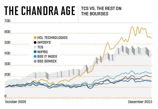 There are other reasons Chandra inspires confidence. He has proven his élan with numbers—people close to him say he goes into a cave a week before the quarterly results, to absorb the numbers of all of TCS’s 60 subsidiaries. In 2009-10, TCS had 409 million-dollar client accounts, apart from seven $100 million deals. Five years later, the corresponding figures were 791 and 29. In effect, Chandra’s teams doubled the number of small deals, and quadrupled the big ones. Recently, TCS became the most-valued enterprise services company in the world, after IBM.